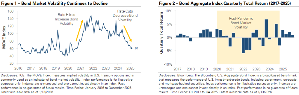 The past few years have tested the role of fixed income in portfolios. Today, the combination of lower interest rate volatility and higher starting yields points toward a more familiar risk and return profile. Bonds could still experience volatility if inflation or policy expectations shift again, but they’re behaving more like an asset class that can provide a blend of diversification and income. As bond market conditions normalize, now may be a good time to revisit your fixed income allocation and ensure your portfolio remains aligned with your long-term goals.